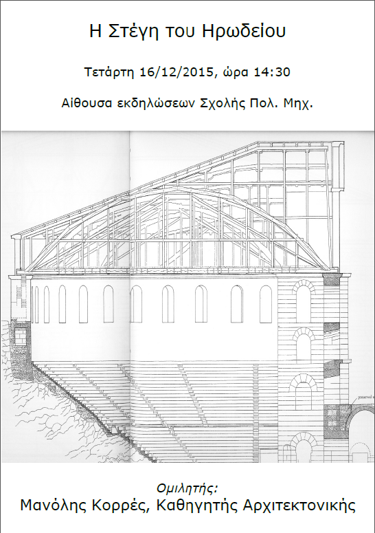 Την Τετάρτη 16/12/2015, ώρα 14:30 θα πραγματοποιηθεί διάλεξη με τίτλο "Η Στέγη του Ηρωδείου" στην Αίθουσα Εκδηλώσεων Σχολής Πολ. Μηχ.