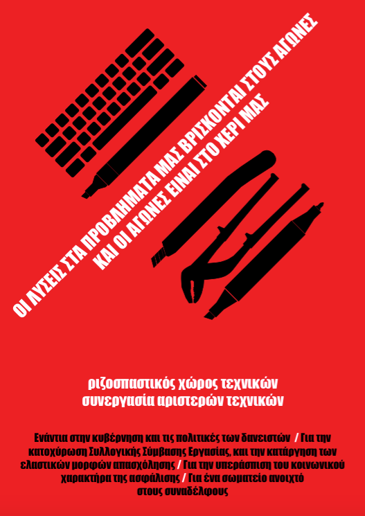 Επειδή οι λύσεις στα προβλήματα μας βρίσκονται στους αγώνες και οι αγώνες είναι στο χέρι μας, στις εκλογές του Σωματείου Μισθωτών Τεχνικών, του σωματείου μας, ψηφίζουμε Ριζοσπαστικό Χώρο Τεχνικών- Συνεργασία Αριστερών Τεχνικών.