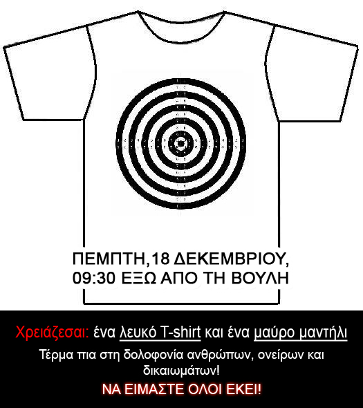 Γι αυτο λοιπον σας καλουμε να συμμετεχετε τη Πεμπτη 18 Δεκεμβριου και ωρα 9:30 π.μ σε μια βουβη διαμαρτυρια εξω απο το κοινοβουλιο.Θα φορουμε ολοι ασπρα μπλουζακια με ζωγραφισμενους στοχους στο στηθος και ενα μαυρο μαντηλι που θα καλυπτει τα ματια.Το μονο που εχετε να κανετε ειναι να εχετε μαζι σας ενα ασπρο φανελακι και οσοι απο εσας εχετε η μπορειτε να προμηθευτειτε,ενα μαυρο μαντηλι.