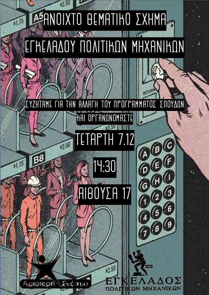 Όλοι και Όλες αύριο στη Γενική Συνέλευση Τμήματος, στις 14:30, στην αίθουσα εκδηλώσεων της Σχολής, για να διασφαλίσουμε ότι δεν γίνεται να υπερψηφιστεί ένα Πρόγραμμα Σπουδών, αντίθετο στη γνώμη του Φοιτητικού Συλλόγου!