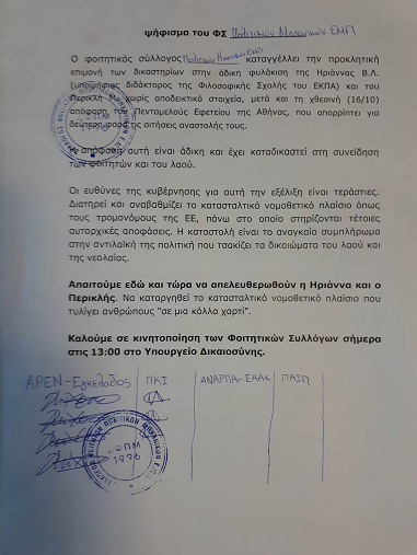 Χθεσινή απόφαση του ΔΣ. Στηρίζουμε τον αγώνα της Ηριάννας Β.Λ. και του Περικλή ενάντια στον κρατικό και το δικαστικό αυταρχισμό.