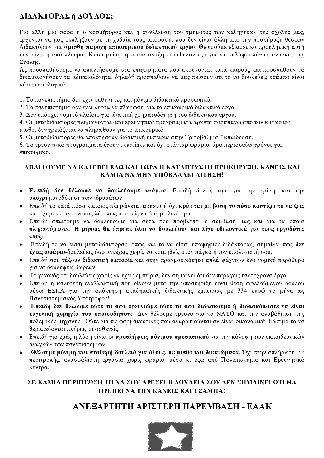 Μετά από κινητοποίηση φοιτητικών και διδακτορικών συλλογών η εν λόγω προκήρυξη παγώνει! Το φοιτητικό κίνημα διεκδικεί και κερδίζει!