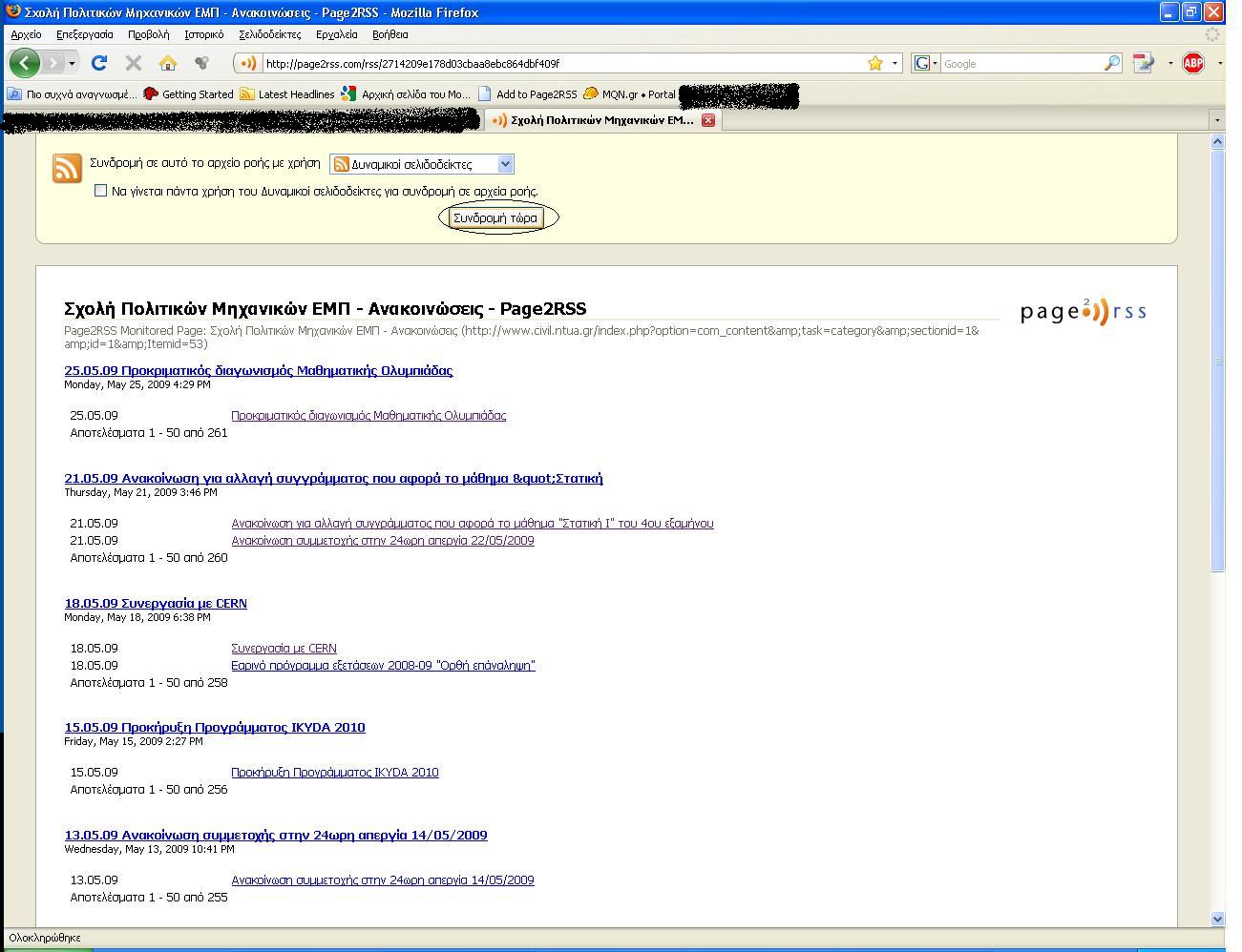 Ανοίγουμε τη σελίδα που θέλουμε rss και πατάμε στην toolbar το σελιδοδείκτη που μόλις δημιουργήσαμε, οπότε οδηγούμαστε σε μια οθόνη σαν αυτή: