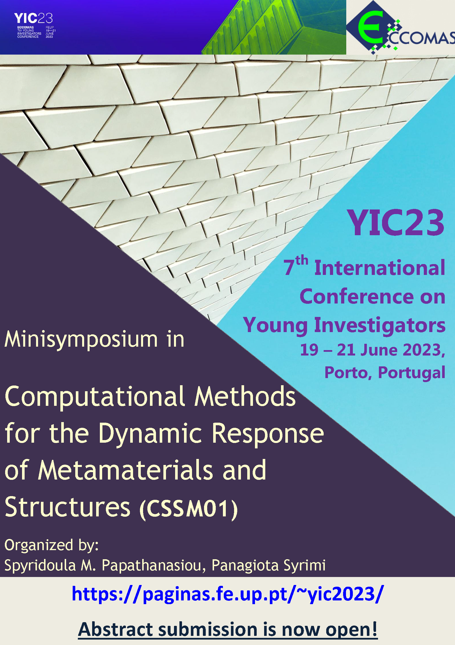 We are pleased to inform you that we are organizing a Mini-Symposium entitled CSSM01 – “Computational Methods for the Dynamic Response of Metamaterials and Structures”, in the 7th ECCOMAS Young Investigators Conference (YIC2023), which will be held on June 19-21, 2023 at Porto, Portugal.