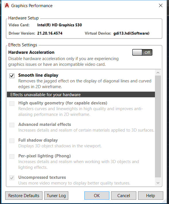 Αν είναι ανοιχτές και οι δύο κάρτες γραφικών το autocad παίρνει την nvidia (και πετάει μπλε οθόνες...). Όταν κλείνω την intel το autocad παίρνει αυτήν και δουλεύει σχεδόν κανονικά...(πρέπει να κλείνω το hardware acceleration για να μην παραμορφώνει τα σχέδια)