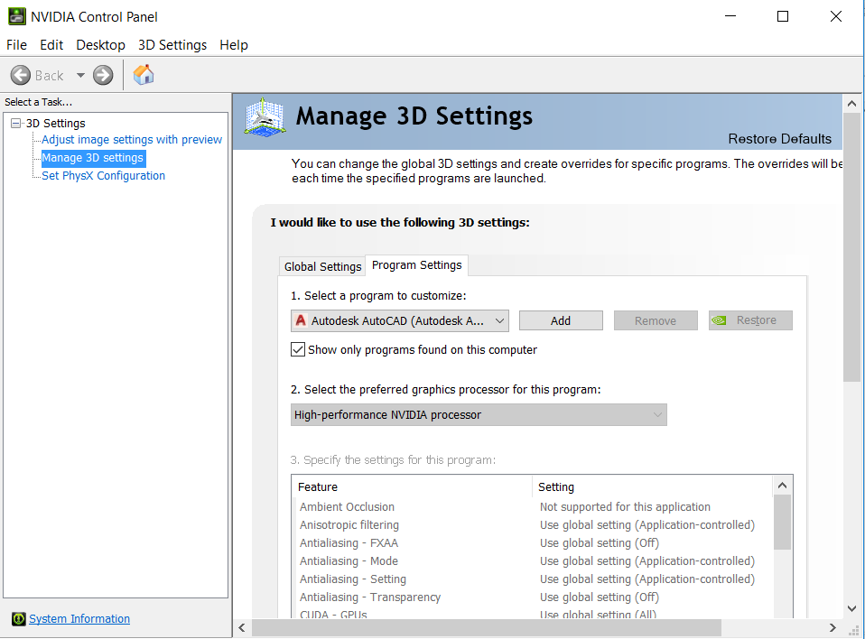 Σύμφωνα με την παρακάτω εικόνα έχω ορίσει την nvidia ως κάρτα που θα χρησιμοποιεί το autocad?