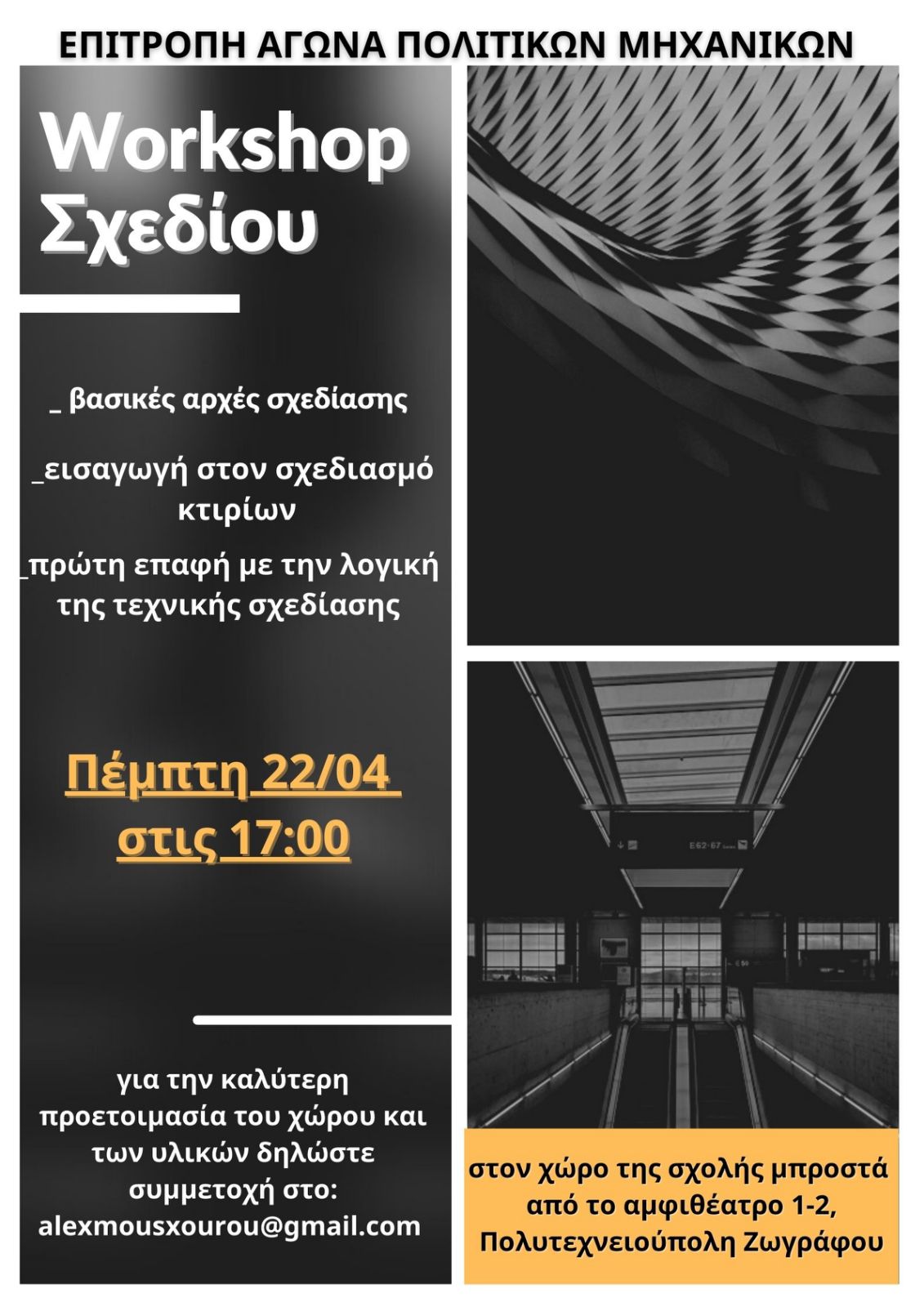 Στο πλαίσιο των δράσεων της Επιτροπής Αγώνα Πολιτικών Μηχανικών σας καλούμε την Πέμπτη 22/4 στις 17:00 έξω απο το Αμφ 1/2 στο Workshop σχεδίου στο όποιο θα παρουσιαστούν: