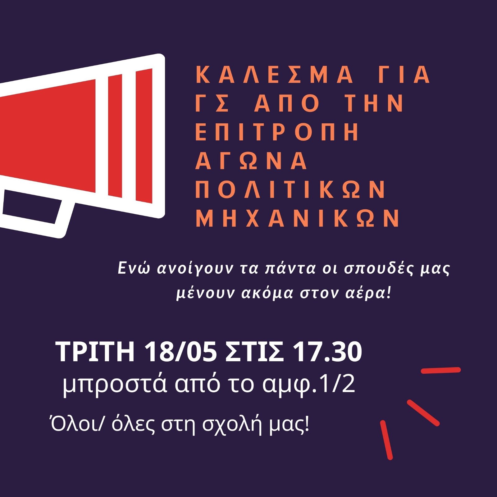 ΚΑΛΕΣΜΑ ΤΗΣ ΕΠΙΤΡΟΠΗΣ ΑΓΩΝΑ ΠΟΛΙΤΙΚΩΝ ΜΗΧΑΝΙΚΩΝ ΣΕ ΓΕΝΙΚΗ ΣΥΝΕΛΕΥΣΗ ΤΗΝ ΤΡΙΤΗ 18/5 ΩΡΑ 17:30 ΕΞΩ ΑΠΟ ΤΟ ΑΜΦΙΘΕΑΤΡΟ 1/2