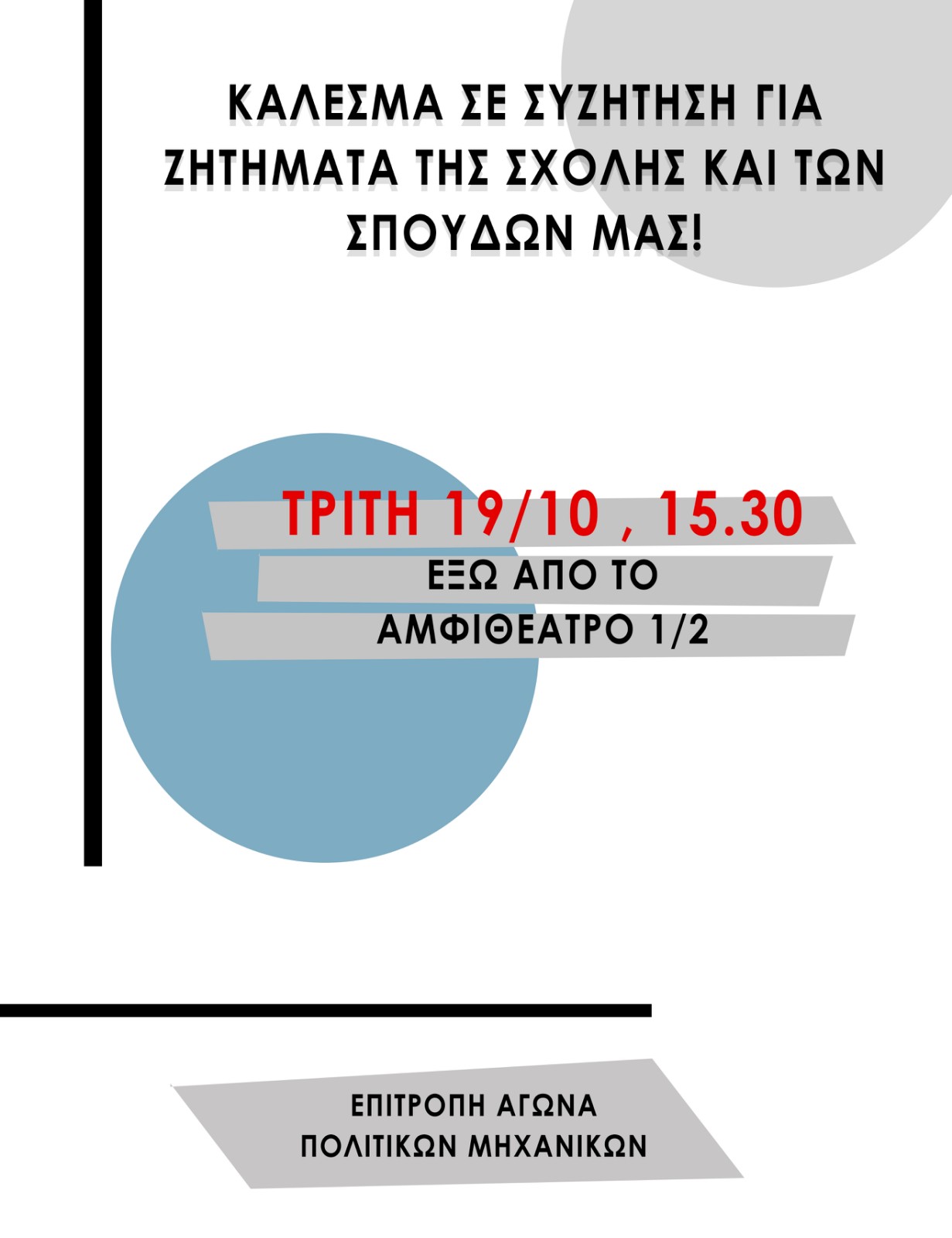 Η Επιτροπή Αγώνα Πολιτικών Μηχανικών απευθύνει κάλεσμα σε συζήτηση για θέματα της σχολής και των σπουδών μας, την Τρίτη 19/10 στις 15.30 έξω απο το Αμφ. 1/2 με τήρηση των μέτρων ασφαλείας της υγείας μας.