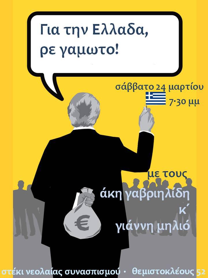 Ρε ''stalin'' δεν φτάνει που ο άνθρωπος (ενώ εχει κονομήσει και θα μπορούσε να είναι στη βίλλα του) κάθεται και τρώει γιαούρτια, μπουκάλια, πορτοκάλια κ.α., προκειμένου να βάλει ενα λιθαράκι στην προπαγάνδιση της πολιτικής σας, έρχεσαι εσύ και ανεβάζεις κειμενάκια που τον χλευάζουν....Αχ, σ αυτή τη χώρα όλοι πάμε να βγάλουμε το μάτι του συνεργάτη μας. Γι αυτό δεν πάει μπροστά η Ελλάδα....Νισάφι πια....