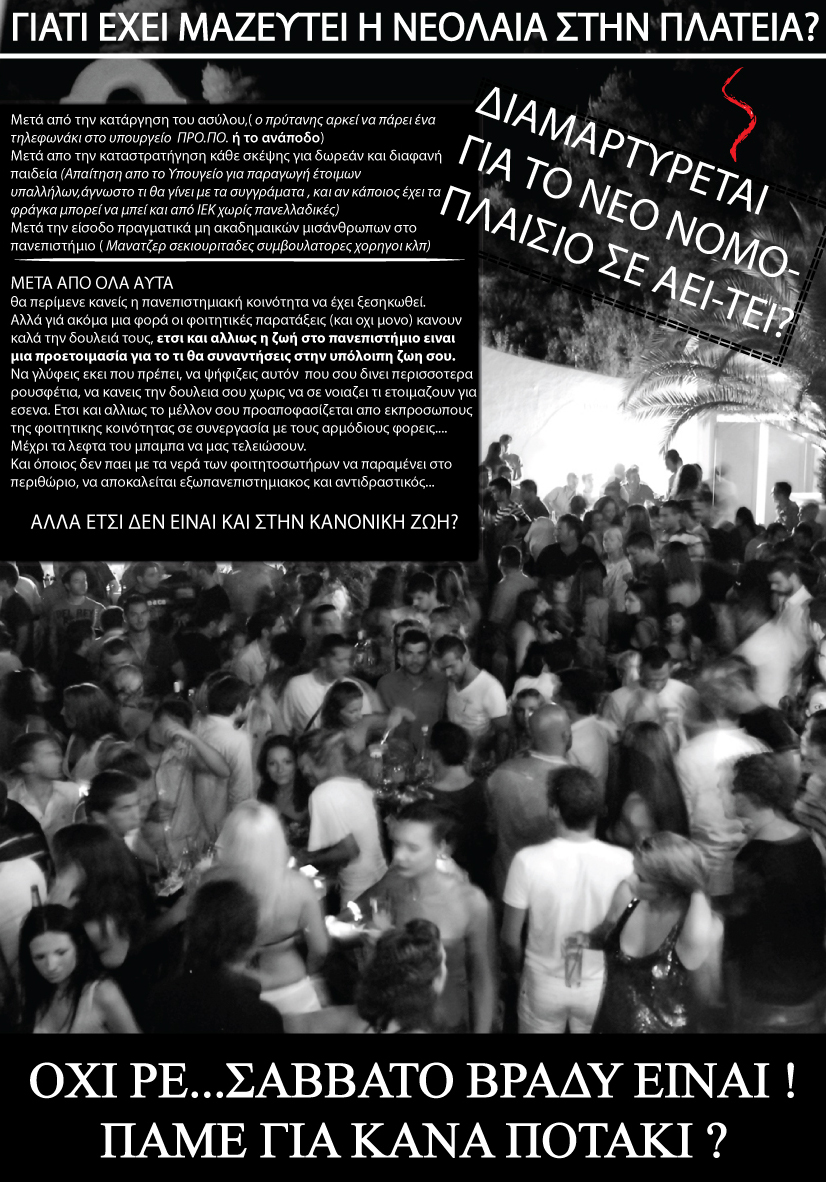 Αν και ελαφρώς πιωμένος, καλό θα είναι να πούμε (σοβαρά) πως το λιγότερο που πρέπει να κάνουμε είναι να κλείσουμε τις σχολές όχι μέχρι να παρθούν πίσω τα μέτρα, αλλά στην διάρκεια των καταλήψεων να αναδειχθούν νέες προτάσεις (το αντι-νομοσχέδιο:P) που θα βελτιώνουν ή θα θέλουν να βελτιώνουν το πανεπιστήμιο, όπως για παράδειγμα πλήρης κατάργηση της κρατικής χρηματοδότησης και είσοδος μεγάλων τεχνικών εταιριών στα πολυτεχνεία , κατάργηση της λέσχης και εκδημοκράτιση της ώρας φαγητού:Goodies, McDonalds,KFC,Γρηγόρης.Επίσης επιβολή διδάκτρων στους φοιτητές γιατί α)είναι ορθολογικό β)τίποτα δεν είναι τσάμπα στον καπιταλισμό, δημιουργία ευνοϊκών συνθηκών ώστε ο φοιτητής να αναγκάζεται να παίρνει φοιτητοδάνεια, συμβάλλοντας έτσι θετικα στην οικονομία της κοινωνίας(ως γνωστών οι τράπεζες είναι φίλοι μας), εκδημοκράτιση των διαδικασιών λήψης αποφάσεων που αφορούν την ακαδημαϊκή κοινότητα στο σύνολό της μέσω της κατάργησης των γενικών συνελεύσεων των φοιτητών και της θεσμοθέτησης προσώπου με απόλυτες και έκτακτες εξουσίες ο οποίος πρέπει να ανήκει σε έναν από τους εκάστοτε χορηγούς του ιδρύματος.