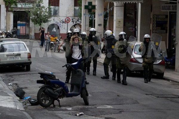 Η φωτογραφία δείχνει έναν άνδρα των ΜΑΤ να κρατάει μια νεαρή κοπέλα, χωρίς κουκούλα, μπροστά από τη διμοιρία του, σαν ανθρώπινη ασπίδα από τις πέτρες των διαδηλωτών.