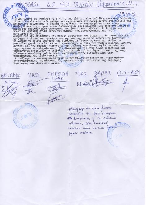 Το δεύτερο έγγραφο δηλώνει την υποστήριξη του φοιτητικού συλλόγου στα μέσα αντιπληροφόρησης και φέρει τις υπογραφές όλων. Το 2ο έγγραφο, δηλώνει την στήριξη του Φ.Σ. να λειτουργούν απρόσκοπτα τα 2 εγχειρήματα αντιπληροφόρησης σε χώρο της Σχολής και φέρει τις υπογραφές των όλων των φοιτητικών παρατάξεων του Δ.Σ. του Φ.Σ. ανάμεσα σε άλλα ακόμη και της ΔΑΠ.