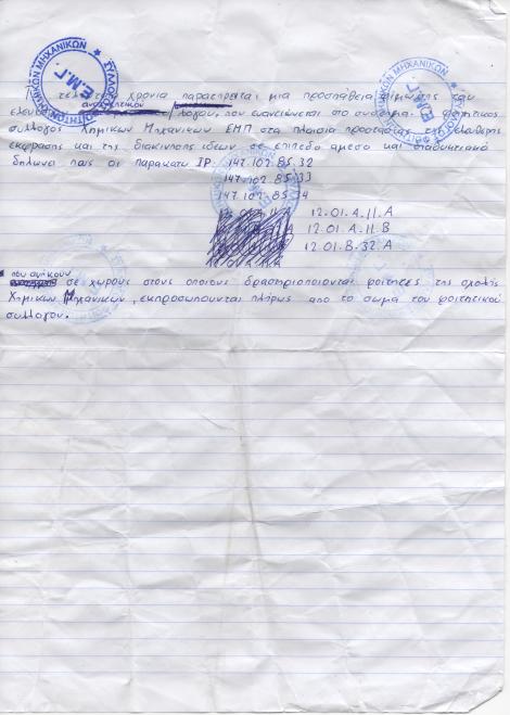 Το πρώτο αφορά τις I.P. που εξέπεμπαν το athens.indymedia.org και το ράδιο 98Fm και είναι από το Δ.Σ. του Φοιτητικού Συλλόγου Χημικών Μηχανικών του ΕΜΠ. Έγινε μετά από αντίστοιχη απαίτηση της Κοσμητείας της Σχολής Χημικών Μηχανικών για δήλωση των I.P. από τον φοιτητικό σύλλογο. Φέρει τη σφραγίδα του με ημερομηνία 12 Οκτώβρη του 2012.