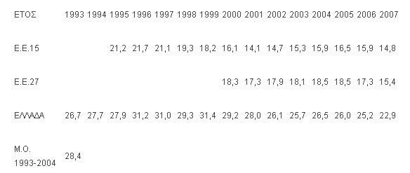 ΠΟΣΟΣΤΟ ΦΤΩΧΕΙΑΣ ΣΕ ΕΛΛΑΔΑ, Ε.Ε.-15, Ε.Ε.-27 (1995-2007)