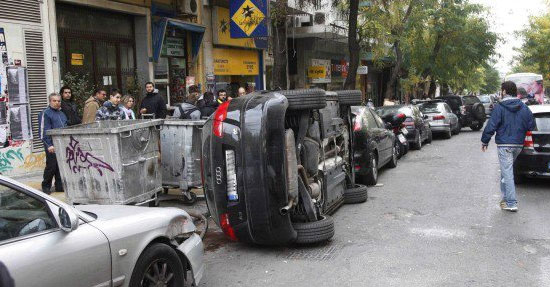 Στα Εξάρχεια καταγράφηκε ιστορικά το πρώτο… αναποδογύρισμα αυτοκινήτου στην Αθήνα. Ένας κλασικός (και με …αγωγή) Έλληνας οδηγός είχε διπλοπαρκάρει στη συμβολή των οδών Σπύρου Τρικούπη και Στουρνάρη εμποδίζοντας φυσικά την κυκλοφορία.