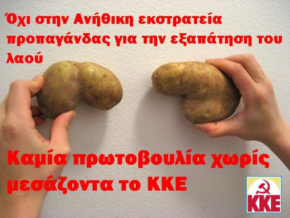 agnwstos x έγραψε:Ακριβώς επειδή δεν πρέπει να ξεφουσκώσει και πρέπει να αφορά περισσότερα προιόντα κάθε κόμμα,συλλογικότητα κλπ που αυτοχαρακτηρίζεται κομμουνιστικό πρέπει να ενισχύσει το μερικό και να το συνδέσει με το συνολικό δηλαδή με όλους τους παραγαγωγούς κλπ και όχι να κατακρίνει μια οποιαδήποτε προσπάθεια αλληλεγγύης(που πετώντας τους μεσάζοντες ,στην πράξη δεν αμφισβητεί τους νταβατζήδες του καπιταλισμού?) επειδή την προβάλλουν τα ΜΜΕ(με τη λογική σου και το ΚΚΕ θυμάσαι πότε είχε γίνει τηλεμαιντανός των παραθύρων?Τότε που έλεγε για χαιδεμα αυτιών και σπασμένα τζάμια.Τι συμπέρασμα να βγάλω??)
