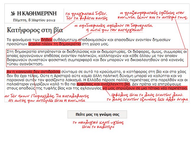 Τι σημαίνει αυτό? Οτι δηλαδή οταν ξεφουσκώσει και αυτό το δήθεν κίνημα πάλι το κκε θα φταίει? Για να καταλάβω κι εγω τα λογικά άλματα...Το π.α.με και κατ επέκταση το κκε (αν θες) δεν επιβεβαιώνεται μόνο με αρνητικά γεγονότα. Καθημερινά σε χώρους εργασίας σημειώνονται μικρές και μεγάλες νίκες ενάντια στην εργοδοσία και στις αυθαιρεσίες της (πάρσιμο πίσω απολύσεων , υπογραφή συλλογικών συμβάσεων κ.λ.π). Αυτά βέβαια δεν ειναι αποτέλεσματα ενός κκε - εργολάβου αγώνων αλλά της οργάνωσης των εργαζομένων σε ταξική βάση και της ώριμης διεκδίκησης των δικαιωμάτων τους. Το κκε απλά τους τροφοδοτεί με επιχειρήματα και ανάλυση που αντέχει στην καθημερινή και εφ όλης της ύλης αντιπαράθεση με το σύστημα...Οσον αφορά τους aganaktistas αναφέρομαι ετσι υποτιμητικά διότι και εκεί υπήρχε μία μορφή καθοδήγησης που άλλες φορές ήταν αφανής και εξυπηρετούσε απλά το ξεφούσκωμα της κατάστασης, και άλλες φορές ήταν πολύ πιο εμφανής ,οταν συγκεκριμένα κόμματα και αυτοαποκαλούμενοι αναρχικοί μοίραζαν κανονικά το υλικό τους ενώ απαγόρευαν σε άλλους να μοιράσουν το δικό τους και να συζητήσουν με τον κόσμο....Αποτέλεσμα λοιπόν ήταν να μοιάζει το όλο σκηνικό με εναν ακτιβισμό ανέξοδης εκτόνωσης τύπου atenistas, patrinistas, salonistas που οδήγησε πολύ κόσμο σε περαιτέρω απογοήτευση. Το ότι πρέπει ο κόσμος να βγαίνει στις πλατείες και να συζητάει εννοείται πως είναι θετικό και οτι πρέπει να ξαναγίνει. Αλλά ελεύθερα, χωρίς την καθοδήγηση του realdemocracy.gr