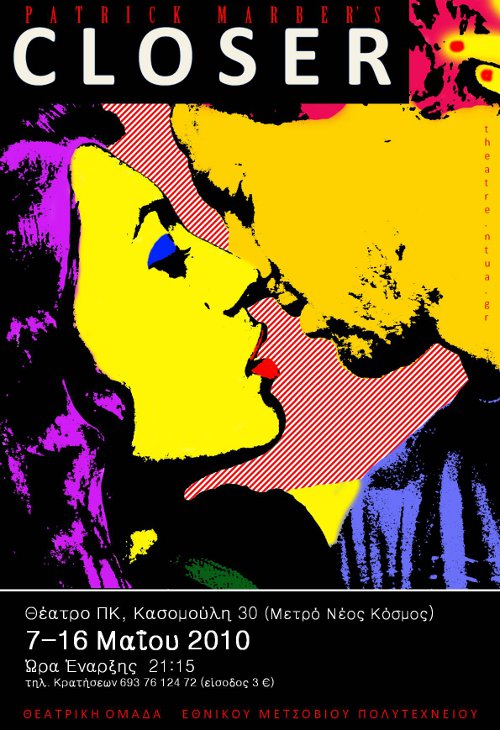 Τα παιδιά στο Closer δοκιμάζουν κάτι διαφορετικό, με μικρή διανομή, και τις καλύτερες ερασιτεχνικές ερμηνείες που χω δει από την ομάδα του ΕΜΠ (3 χρόνια πηγαίνω ως θεατής). Το έργο είναι τολμηρό και ξεφεύγει αρκετά από τις γνωστές συνταγές, κάνοντας κάποιες βαθές τομές στις ανθρώπινες σχέσεις μέσα από δηλητηριώδεις διαλόγους και "ζόρικες" σκηνές.