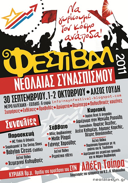 * Ποιοι είναι οι λόγοι που σε κάνουν να συμμετέχεις στο συγκεκριμένο φεστιβάλ της νεολαίας του ΣΥΝ;Για να προτείνω ένα μουσικό πρόγραμμα, μια πρόσκληση σε ένα λαϊκό γλέντι. Προσπάθεια ομαδική, με εξαίρετους μουσικούς και τέσσερις ερμηνευτές επί σκηνής, αφού, μαζί μου θα είναι ο Πέτρος Βαγιόπουλος, η Λιζέτα Καλημέρη και ο Λάμπρος Καρελάς.