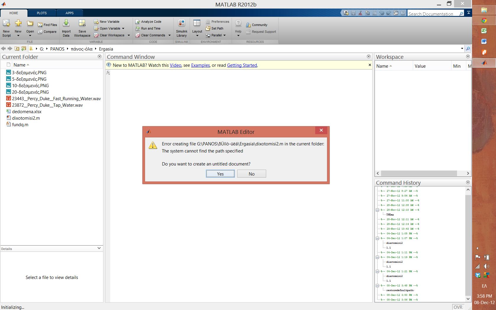 Στο matlab, όταν ανοίγω κάποιο script όπου το path είναι στα ελληνικά πετάει το μήνυμα της 1ης εικόνας από αυτές που φαίνονται κάτω. Κάνοντας κλικ στο yes, πετάει και το 2ο. Καμιά ιδέα?