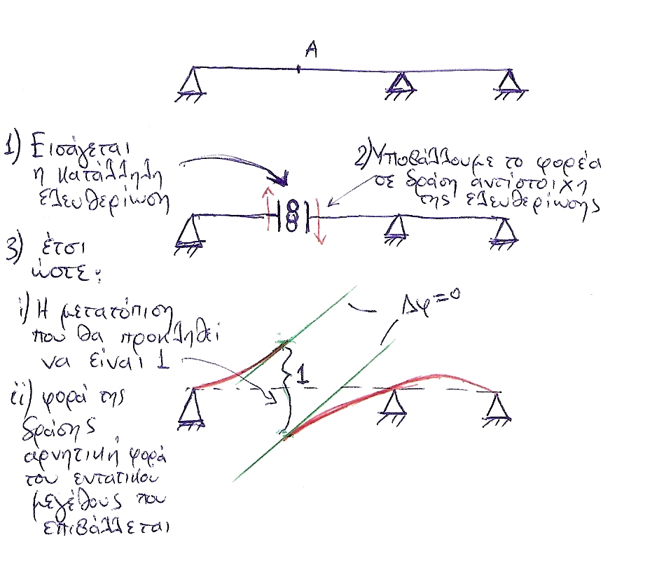 Στο κείμενο word με τίτλο "grammes_epirrohs.doc" όπου επισύναψα σε προηγούμενη δημοσίευσή μου, στο τέλος απεικονίζεται η (ποιοτική) γραφική παράσταση της συνάρτησης της γραμμής επιρροής (η οποία είναι όμοια με την ελαστική γραμμή, αλλά δεν είναι η ελαστική γραμμή! - διαβάστε καλύτερα τον ορισμό της Αρχής Mueller-Breslau), σε ένα καρτεσιανό σύστημα συντεταγμένων. Συνεπώς, η σχετική αυτή μετακίνηση των άκρων της κυλιόμενης πάκτωσης (την οποία ο κ. Κουμούσης ονομάζει F11) θα πρέπει να φαίνεται κάθετη στον άξονα των τετμημένων, ο οποίος συμπίπτει με τον άξονα του μήκους της συνεχούς δοκού.