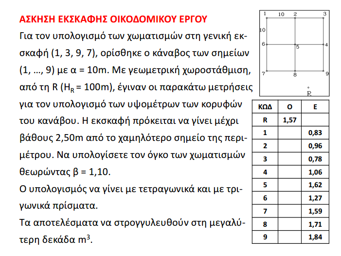 1ο: ένα με εκσκαφές και έδινε και έναν πίνακα με δεδομένα, ακριβώς όπως τη μία συνημμένη εικόνα "θέμα_εκσκαφών" (είναι από την 5η σειρά διαφανειών με τίτλο "ΧΑΡΑΞΕΙΣ – ΥΠΟΛΟΓΙΣΜΟΙ ΕΜΒΑΔΩΝ & ΟΓΚΩΝ / 30 – 4 – 2020".