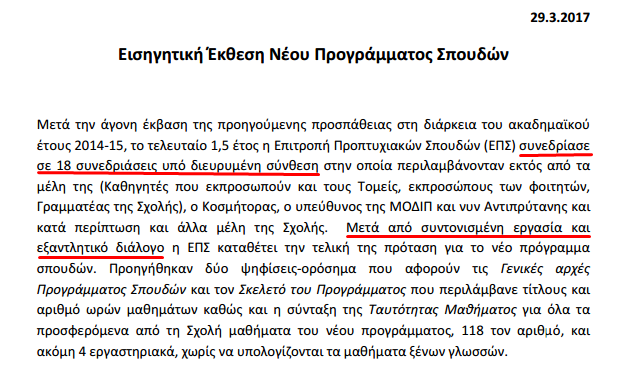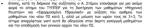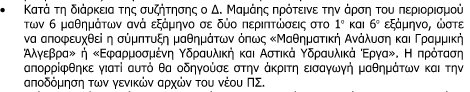 Το αίτημα (σ.σ. του Στάμου για διατήρηση Μτρ και ΕφΥδρ) απορρίφθηκε για άλλη μια φορά με την αιτιολογία του απαράκλητου κανόνα του μέγιστου αριθμού μαθημάτων σε 6χ9=54 , η μη τήρηση του οποίου ενδέχεται να ανοίξει τους "ασκούς του Αιόλου"