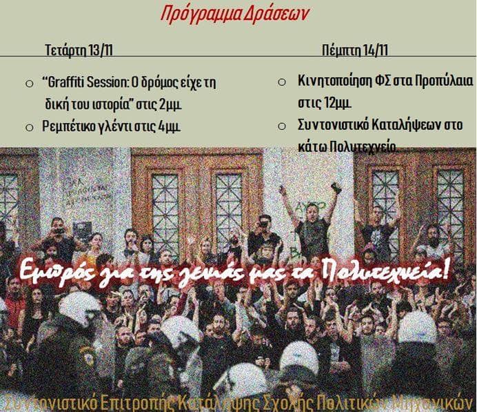 -Κατάληψη της σχολής από Τετάρτη 13/11 μέχρι και την Κυριακή 17/11 και μεταφορά της κατάληψης στο κάτω Πολυτεχνείο το τριήμερο του εορτασμού.