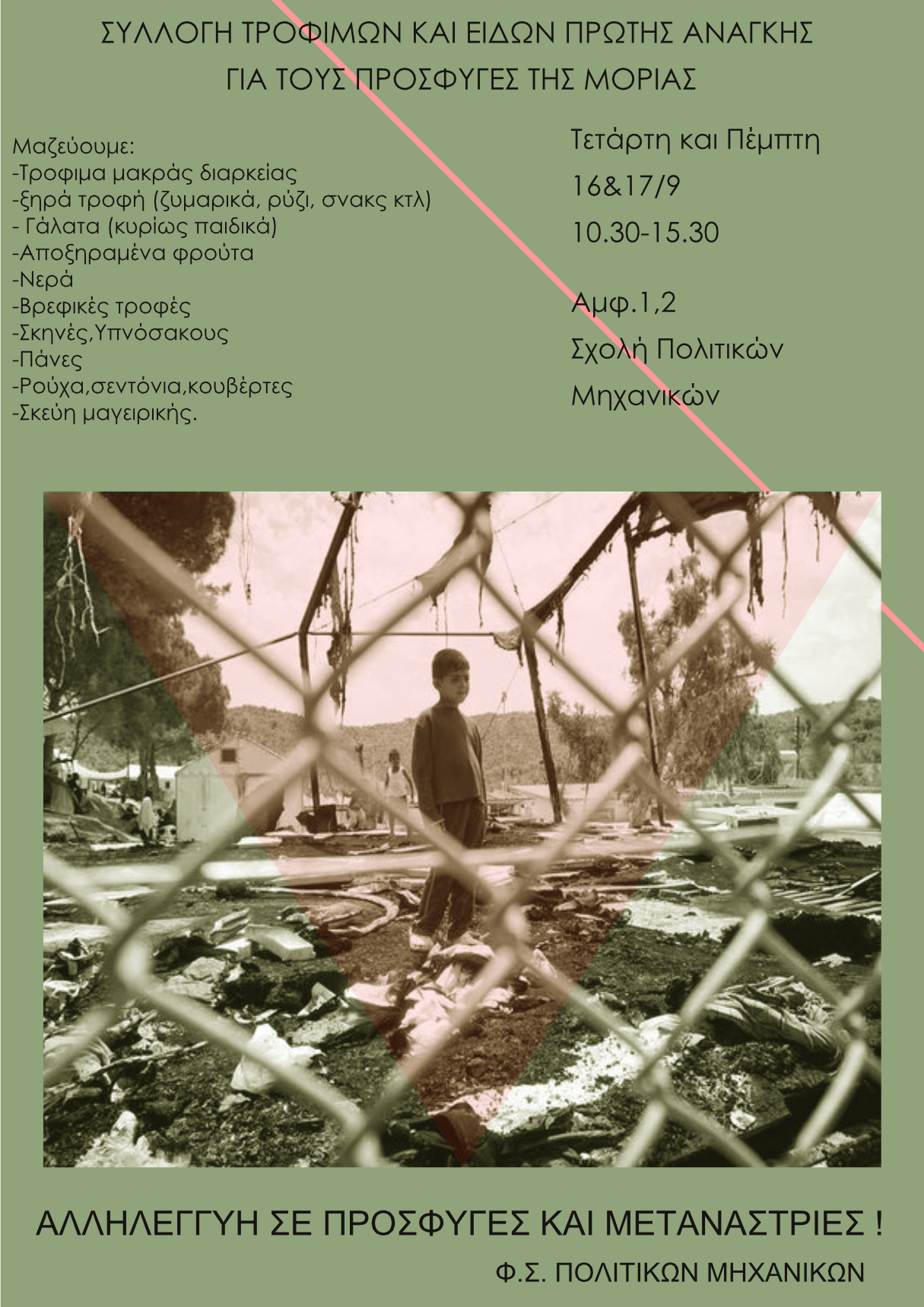 Απαιτούμε το κλείσιμο όλων των φυλακών-κέντρων κράτησης και την άμεση εξασφάλιση στέγης και υγειονομικής περίθαλψης όλων των προσφύγων. Ως ένδειξη αλληλεγγύης, προβαίνουμε σε συλλογή τροφίμων και ειδών πρώτης ανάγκης έξω από το αμφιθέατρο 1,2.