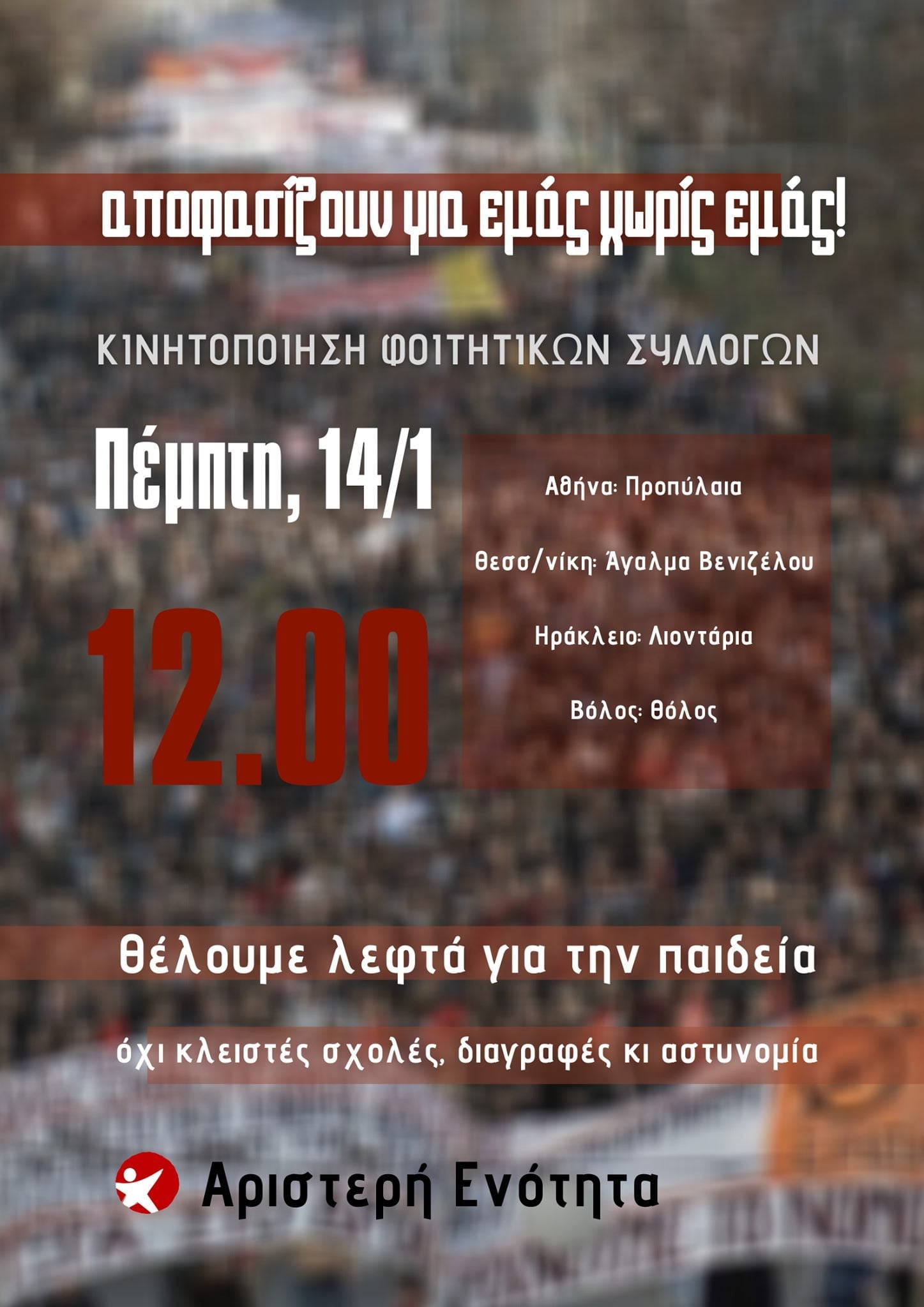Αύριο 14/1 12:00 όλοι/ες στους δρόμους για το μέλλον μας !