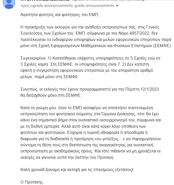 Δύο μέρες πριν τις “φοιτητικές” εκλογές που αποφάσισε να διεξάγει η πρυτανεία ηλεκτρονικά και με ενιαίο ψηφοδέλτιο, παρακάμπτοντας τους φοιτητικούς συλλόγους και τις διαδικασίες τους, μας έρχεται το παρακάτω μέιλ.