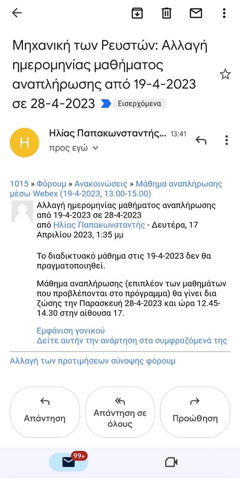 Μετά από απόφαση του φοιτητικού συλλόγου, που πρότεινε το σχήμα μας στο διοικητικό συμβούλιο του συλλόγου σχετικά με την μη διεξαγωγή διαδικτυακών αναπληρώσεων μέσα στο Πάσχα, πετύχαμε η Μηχανική των Ρευστών να μετατεθεί δια ζώσης μετά την έναρξη των μαθημάτων.
