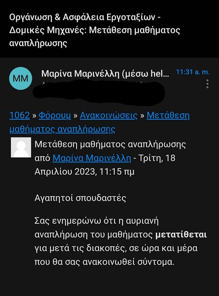 Μετά από απόφαση του φοιτητικού συλλόγου, που πρότεινε το σχήμα μας στο διοικητικό συμβούλιο του συλλόγου σχετικά με την μη διεξαγωγή διαδικτυακών αναπληρώσεων μέσα στο Πάσχα, πετύχαμε το μάθημα "Ασφάλεια Εργοταξίων- Δομικές μηχανές " να μετατεθεί μετά τις διακοπές!