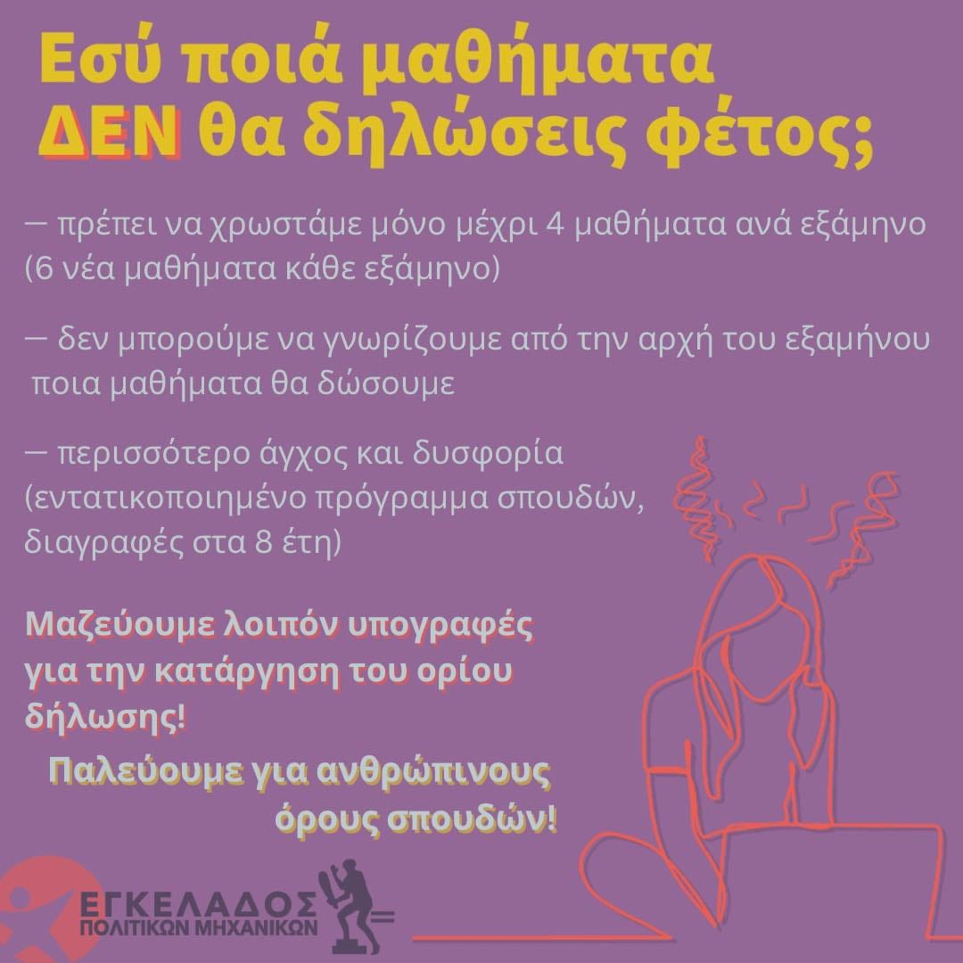 Απαιτούμε την κατάργηση του ορίου δήλωσης, ενός μέτρου της σχολής μας, που μας περιορίζει στα πόσα μαθήματα θα δηλώσουμε το εξάμηνο (10 ανά εξάμηνο- 20 το έτος) στα οποία θα εξεταστούμε!
