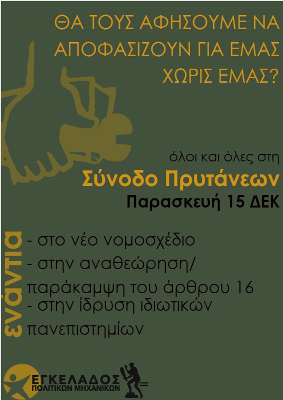 Όλοι και όλες στη Σύνοδο πρυτάνεων την Παρασκευή 15/12 για να δώσουμε το πρώτο ηχηρό μήνυμα στην κυβέρνηση ενάντια στο νέο νομοσχέδιο και την ίδρυση ιδιωτικών πανεπιστημίων!