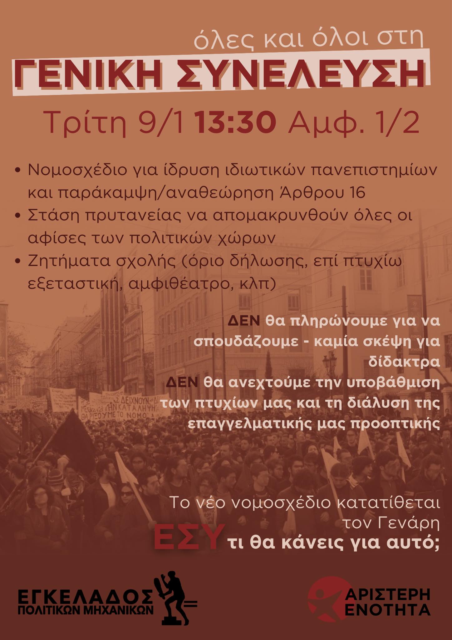 ΓΕΝΙΚΗ ΣΥΝΕΛΕΥΣΗ ΤΡΙΤΗ 9/1 13:30 ΓΙΑ ΤΟ ΝΟΜΟΣΧΕΔΙΟ ΠΟΥ ΦΕΡΝΕΙ ΙΔΙΩΤΙΚΑ ΠΑΝΕΠΙΣΤΗΜΙΑ