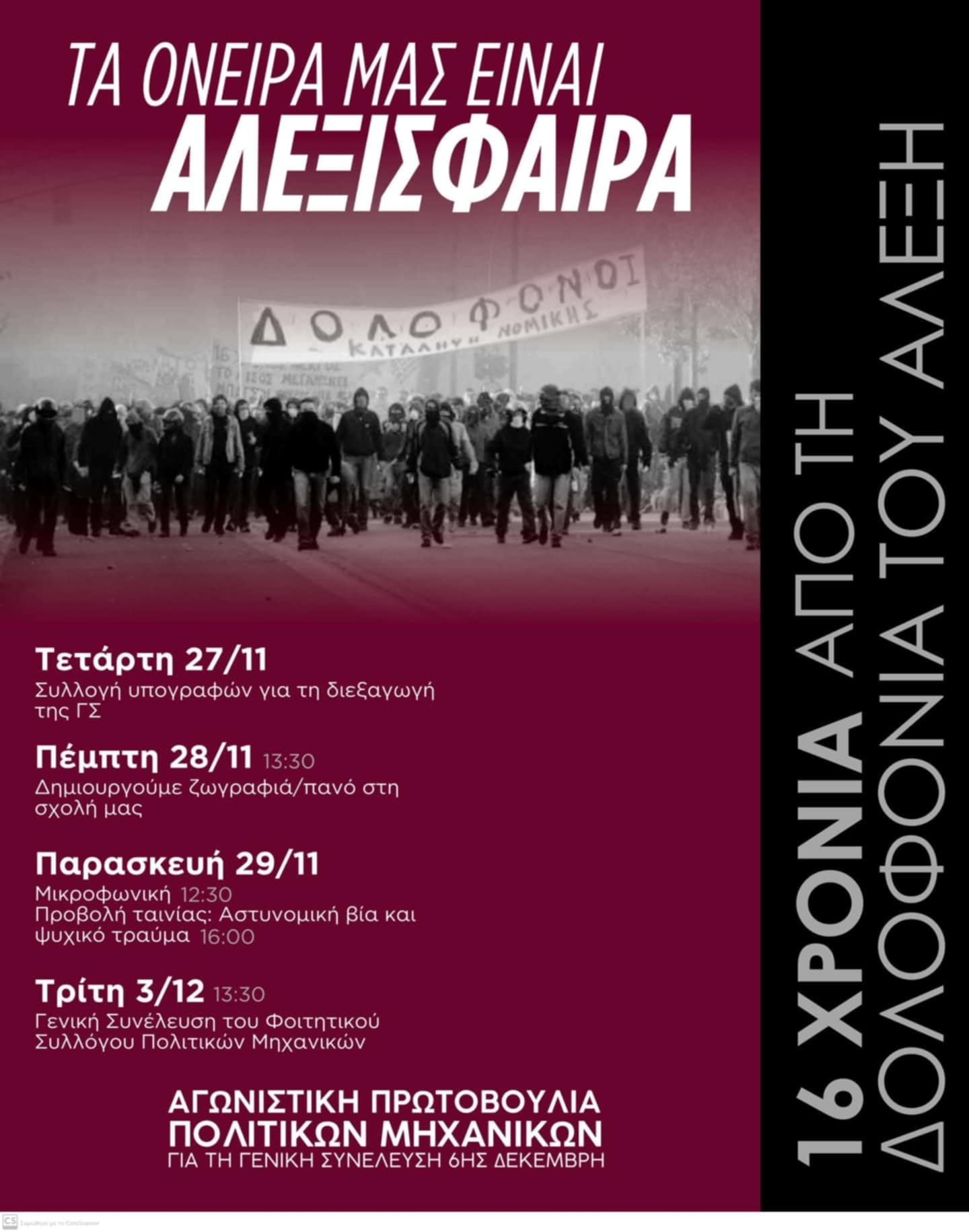 Εν όψει της Γενικής μας Συνέλευσης την Τρίτη 3/12 στη 13:30 για τα 16 χρόνια από την δολοφονία του Αλέξη Γρηγορόπουλου από τον αστυνομικό Κορκονέα ιδρύσαμε στην σχολή μας μια Αγωνιστική Πρωτοβουλία όπου συμμετέχει όποιος και όποια θέλει με σκοπό την ενεργοποίηση της πολιτικής κουβέντας και δράσης αλλά και των Γενικών Συνελεύσεων του Συλλόγου μας!