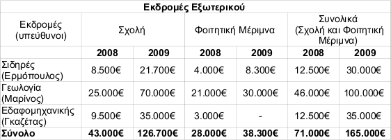 Πέρσι η Σχολή είχε διαθέσει για τις εκδρομές το ποσό των 55.000€ και η Φοιτητική Μέριμνα το ποσό των 28.000€ ενώ, φέτος το συνολικό ποσό για τις εκπαιδευτικές εκδρομές είναι 190.000€, από το οποίο η Σχολή διαθέτει το ποσό των 151.700€ και η Φοιτητική Μέριμνα το ποσό των 38.300€. Δηλαδή, υπάρχει σχεδόν τριπλασιασμός του ποσού που διαθέτει φέτος η Σχολή. Θα πρέπει εδώ βέβαια να σημειωθεί, ότι δεν πρέπει να θεωρούμε δεδομένο ότι τα ποσά αυτά θα μπορούν να διατίθενται και στο μέλλον, καθ’ ότι εξαρτώνται από το ύψος αλλά και την διαχείριση των ετησίως διαθέσιμων ποσών. Ο κάτωθι πίνακας δείχνει αναλυτικά την κατανομή του ποσού για τις εκδρομές εσωτερικού και εξωτερικού.