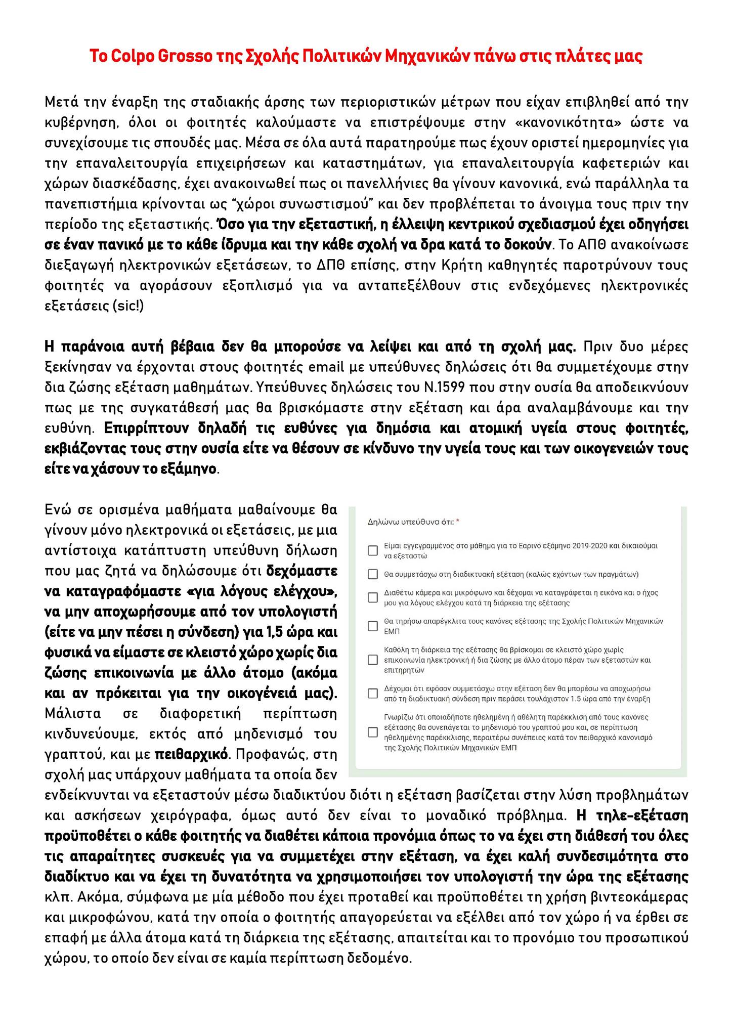 Δεν περιμέναμε κάτι άλλο από την «υπεύθυνη δύναμη» που όλη αυτήν την περίοδο δεν έχει βγάλει ΛΕΞΗ για τα προβλήματα που έχουν προκύψει στους φοιτητές και τις φοιτήτριες. Ούτως αλλιώς οι ηλεκτρονικές εξετάσεις αποτελούν βούτυρο στο ψωμί των μετρ των ομαδικών αντιγραφών, των αρίστων του τσουτσεκώματος με κοσμητεία και καθηγητές, των λαθρέμπορων σημειώσεων, των παιδιών του «καλύτερου βιογραφικού της χώρας». Επειδή όμως ο Φοιτητικός Σύλλογος δεν είναι ούτε η ΔΑΠ, ούτε η σφραγίδα (που φυλάει καλύτερα και απ’ ότι φυλούσε ο Μπίλμπο Μπάγκινς το δαχτυλίδι)- πρέπει να πάρουμε την κατάσταση στα χέρια μας.