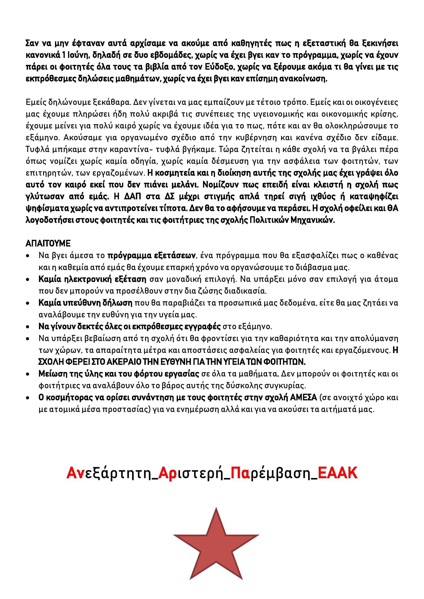 Η διοίκηση της σχολής οφείλει να λογοδοτήσει σε όλους και όλες μας, ενώ μας έχει αφήσει χωρίς καμία ενημέρωση, έχει απορρίψει όλες τις εκπρόθεσμες δηλώσεις, μας έχει βάλει να υπογράψουμε υπεύθυνες δηλώσεις κλπ.