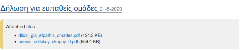 andi100 έγραψε:Με κάθε επιφύλαξη, μέχρι να ανοίξει η γραμματεία την Δευτέρα και να μάθεις 100% μια ιδέα μπορείς να πάρεις κ από .... Στις ανακοινώσεις της σχολής στο .. Δήλωση για ευπαθείς ομάδες κ έγγραφο .. άδειες ειδικού σκοπού.. αναφέρει κάποιες κατηγορίες για τους υπαλλήλους. Λογικά θα είναι ίδιες κ για τους φοιτητές.