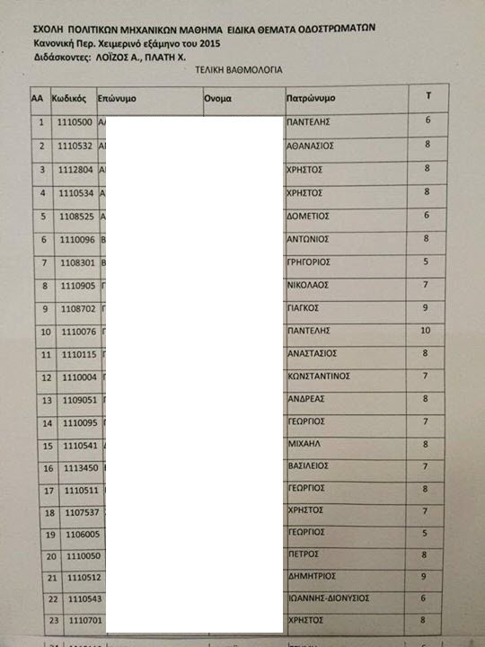 Η βαθμολόγηση του μαθήματος της Περιβαλλοντικής Τεχνολογίας (5ου εξαμηνου) έχει ολοκληρωθεί. Ο κατάλογος με την βαθμολογία βρίσκεται στον 4ο όροφο του κτιρίου υδραυλικής έξω από το γραφείο 401. (απο ανακοινωση στο mycourses)