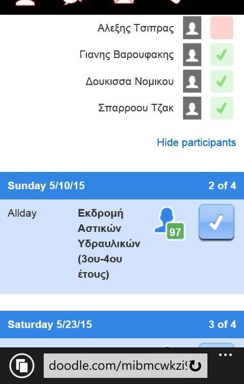 Η δηλώσεις συμμετοχής θα γίνονται εδώ μέχρι το βράδυ του Σαββάτου 25/4 ,όπου ο καθένας γράφει ονοματεπώνυμο και έτος,ενώ παράλληλα τσεκάρει την ημερομηνία που προτιμά (προφανώς όσοι είναι διαθέσιμοι και στις δύο προτάσεις,τσεκάρει και τα 4 κουτάκια).