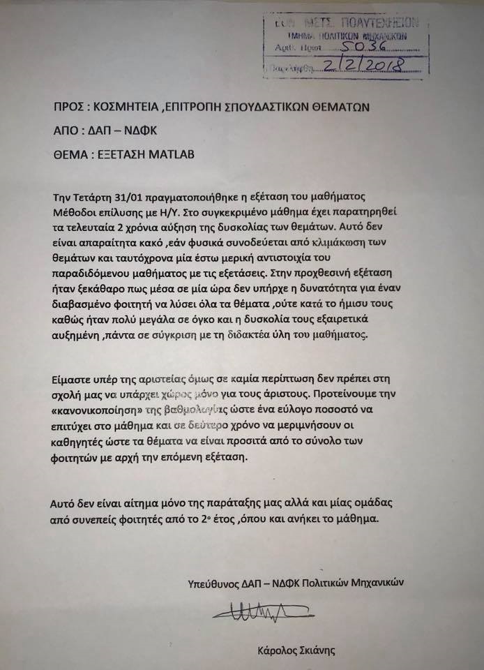 Με αφορμή την εξέταση στο Matlab(31-1-2018) έγραψα με τους συμφοιτητές μου, Αριστοκλή Λαγό και Γιάννη Κοκοτσάκη, ένα γράμμα για τον Κοσμήτορα στο οποίο εκφράζουμε την άποψή μας για αναδιαμόρφωση της εξέτασης. Καθώς όπως προέκυψε το ζήτημα απασχολεί μεγάλη μερίδα συμφοιτητών, αποφασίσαμε να μαζέψουμε υπογραφές για να το κάνουμε πιο συλλογικό και να πιέσουμε να αλλάξει η φιλοσοφία της τελικής εξέτασης. Για τις υπογραφές:https://docs.google.com/spreadsheets/d/1hh8wCJQY2psz6Q89JdgDkElMKmY_ke9hqbr5O698A3Q/edit#gid=0. Θα έρθουμε φυσικά και σε επικοινωνία με τους εμπλεκόμενους καθηγητές . Ακολουθεί η επιστολή: