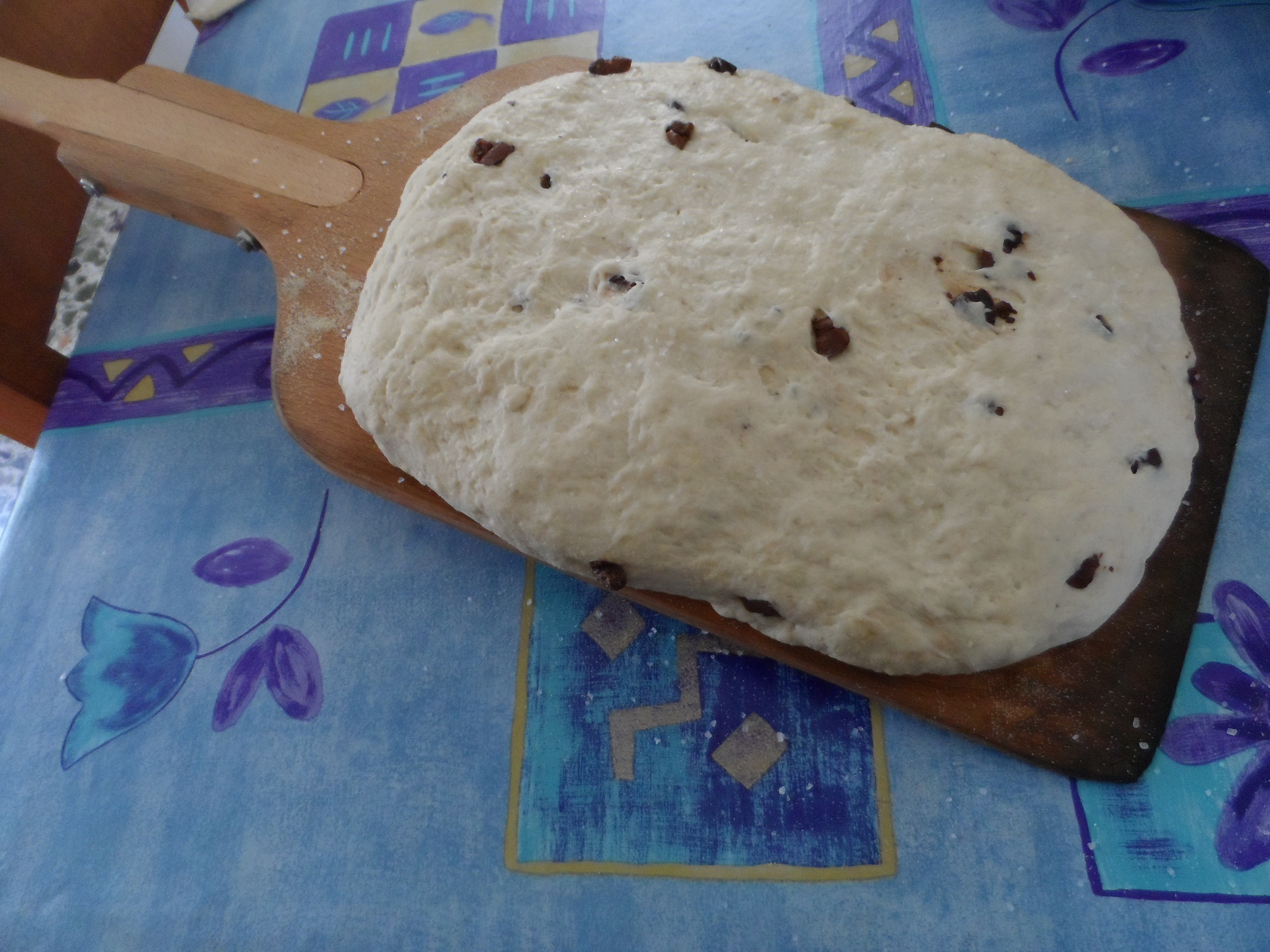 Μορφώνουμε τη ζύμη σε καρβέλι και τοποθετούμε στο φτυάρι του φούρνου αφού πρώτα το πασπαλίσουμε με σιμιγδάλι ή καλαμποκάλευρο για να μη κολλήσει.