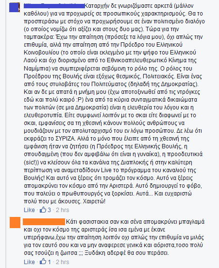 Λοιπον, ο πιθανότατα φιλλελές σχολιαστής έχει δίκιο. Δεν γίνεται να βγαίνεις και να μιλάς για ισότητα και δημοκρατία, αλλά σαν ΠτΒ να κάνεις ευθεία προσωπική επίθεση σε μια "δημοσιογράφο", όποια κι αν είναι αυτή. Δεν γίνεται να μην καταφέρνεις να τηρήσεις τις βασικές προϋποθέσεις διαλόγου, όποιος κι αν είναι ο συνομιλητής σου. Δεν γίνεται να κάνεις κριτική (που σωστά την κάνεις) για προπαγάνδα στα "καθεστωτικά ΜΜΕ", ούσα, όμως, εσύ η ίδια το καθεστώς, το οποίο, μάλιστα, στο ψηφοδέλτιο τοποθέτησε το ΟΧΙ πρώτο και το ΝΑΙ δεύτερο. Και στο φινάλε φινάλε, η ΠτΒ δεν απάντησε ποτέ στην ερώτηση που επίμονα της έκανε η Κοσιώνη σχετικά με το πώς μεταφράζεται το ΟΧΙ στο δημοψήφισμα.
