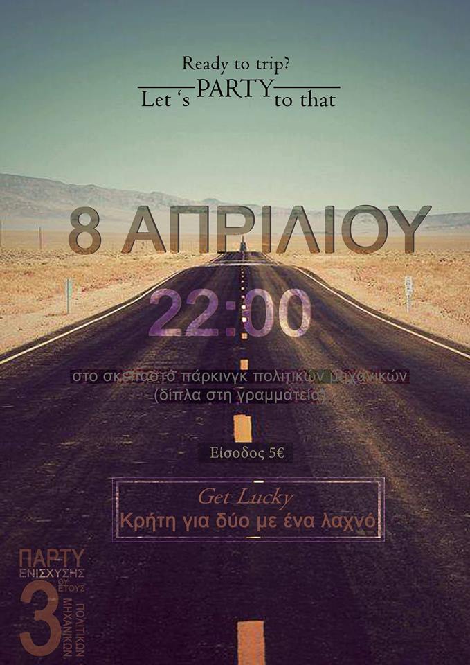 Το παρτυ θα γινει στις 8 Απριλιου στο σκεπαστο γκαραζ της σχολης διπλα απο την γραμματεια (αφισα/event sto fb και αλλα τετοια ερχονται προσεχως). Σας θελουμε ολους εκει οχι μονο για να περασουμε καλα αλλα και να βοηθησουμε για τη σωστη διεξαγωγη του ( ξαναλεω οποιος θελει να μπει στην ομαδα εθελοντων του παρτυ ας μου στειλει μνμ να τον βαλλω στο κλειστο γκρουπ (αφορα το φβ αυτο) - καλο θα ειναι να βοηθησετε οσοι θα συμμετεχετε στην εκδρομη)