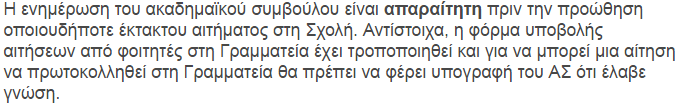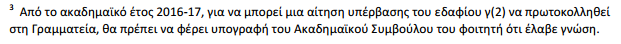 • Οι αιτήσεις υπέρβασης του ορίου δεν χρειάζεται να εγκριθούν από τη ΓΣ της Σχολής και άρα, οι σχετικές αιτιάσεις των καθηγητών του παριστάνουν τους Ακαδημαϊκούς Συμβούλους, είναι ψευδείς και ως μοναδικό στόχο έχουν την αποθάρρυνση των φοιτητών.