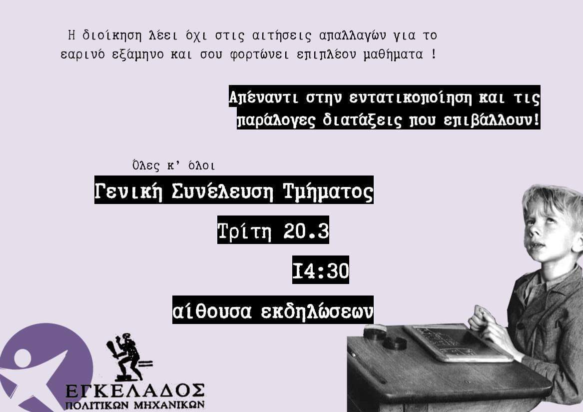 Αύριο στις 14:30 στην αίθουσα εκδηλώσεων πρόκειται να πραγματοποιηθεί η γενική συνέλευση των καθηγητών, κατά την οποία θα συζητηθούν και τα ζήτημα που έχουν προκύψει ως τώρα με την εφαρμογή των μεταβατικών διατάξεων. Όλο αυτό το χάος που έχει δημιουργηθεί με τις μεταβατικες έρχεται να διαψεύσει ευθέως τις υποσχέσεις της διοίκησης για ομαλή μετάβαση. Είναι λοιπόν επιτακτικό να είμαστε όλοι και όλες εκεί, ώστε να μην επιτρέψουμε την επιβάρυνση μας με επιπλέον μαθήματα.